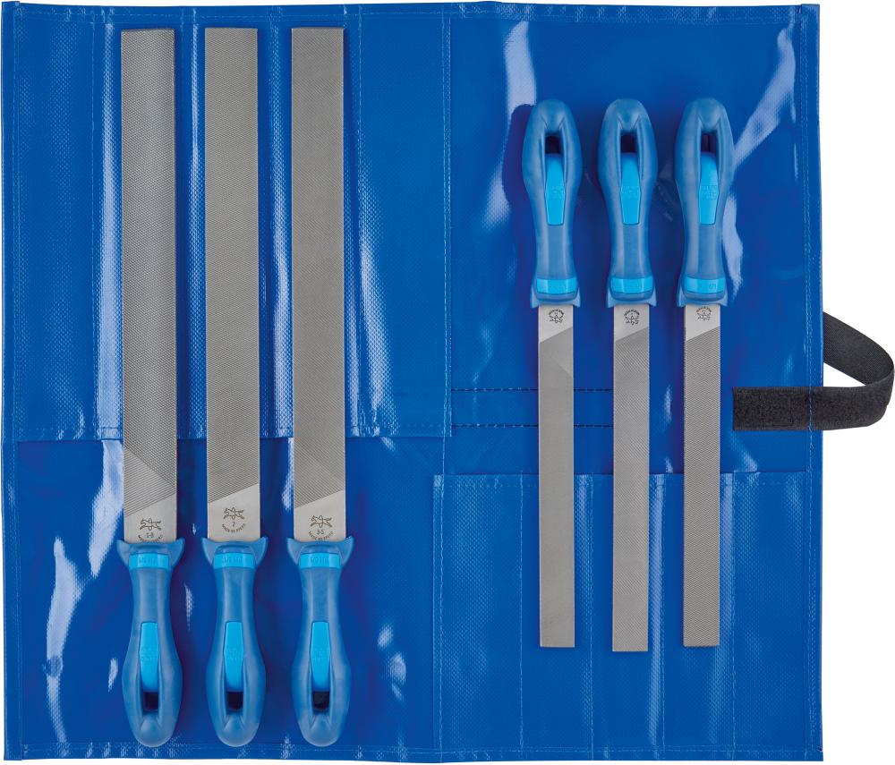 Kvalitetsfilar för industri och hantverk i skyddande och klimatsäker PVC-rullväska för förvaring i verktygslådan eller på arbetsbänken. Varje fil har ett ergonomiskt filhandtag