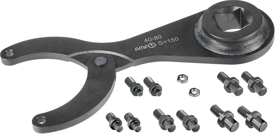Sats med justerbar tappnyckel med 3/4"-fäste för momentnyckel, av härdat och brunerat specialstål, för dubbelhålsmuttrar med utbytbara tappar. Tappavstånd 80-125 mm, tappdiameter 4-5-6-7-8 mm. Mått S 200 mm, L 230 mm. Bilden visar storlek 40-80 mm.