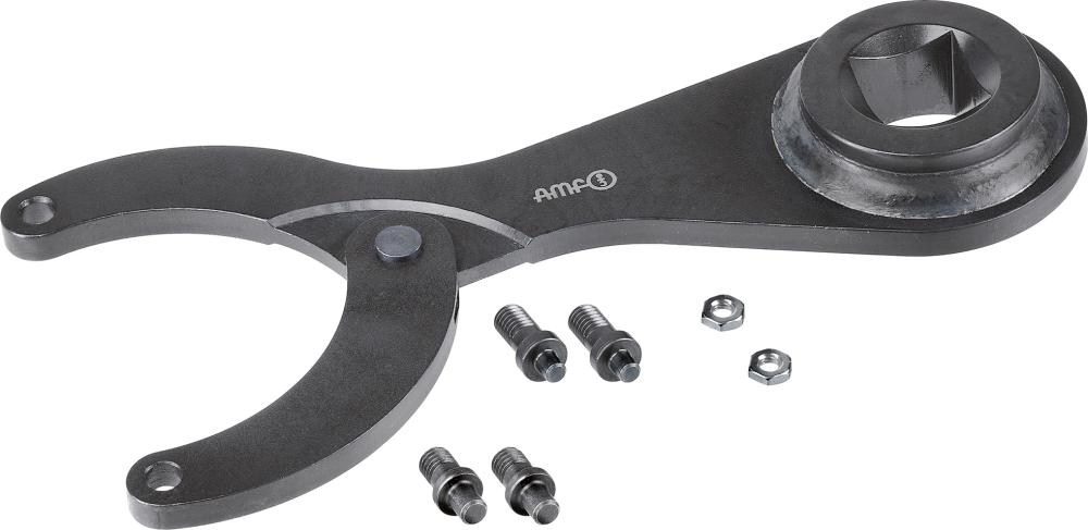 Sats med justerbar tappnyckel med 1/2"-fäste för momentnyckel. Tillverkad av härdat och brunerat specialstål, för dubbelhålsmuttrar med utbytbara tappar. Tappavstånd 18-40 mm, tappdiameter 3-4 mm. Mått S 100 mm, L 120 mm. Bilden visar storlek 40-80 mm.