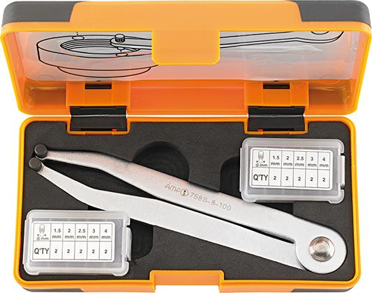 Sats med justerbar tappnyckel, förzinkat specialstål, för dubbelhålsmuttrar med utbytbara tappar. Tappavstånd 8-100 mm, tappdiameter 1,5-2-2,5-3-4 mm. I plastlåda. -