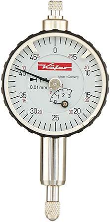 Kompakt indikatorklocka/mätur 0-10 mm, avläsning 0,01 mm. Diameter 40 mm. Med 8 mm-fäste. Enligt DIN 878. Käfer modell KM 4/10. Tillverkad i Tyskland.