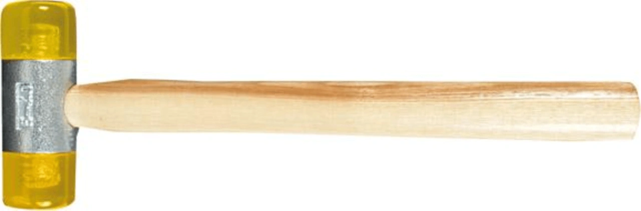 Plasthammare av CA (Cellulosaacetat) med infästning av förzinkat grågjutjärn med träskaft. Vikt 140 g.