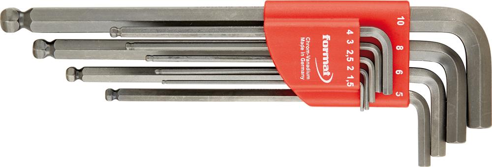 Insexnyckelsats i plasthållare, tillverkade av stålgrått kromvanadinstål. Med klotformad sexkanthuvud i ena änden, vilket medgör åtdragning även vid 30° lutning. Enligt DIN 911 L, ISO 2936 L. Dimensioner 1,5-2-2,5-3-4-5-6-8-10 mm. Fabrikat Format, tillverkade i Tyskland. -