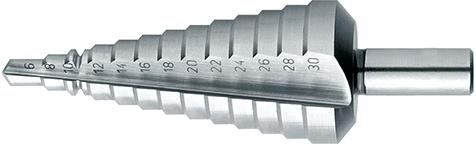 Stegborr HSS med diameter 40-41-42-43-44-45-46-47-48-49-50 mm, steglängd 4 mm, totallängd 107 mm. Skaftdiameter 13 mm. Med speciellt utformad axel för att förhindra att den börjar rotera i chucken.