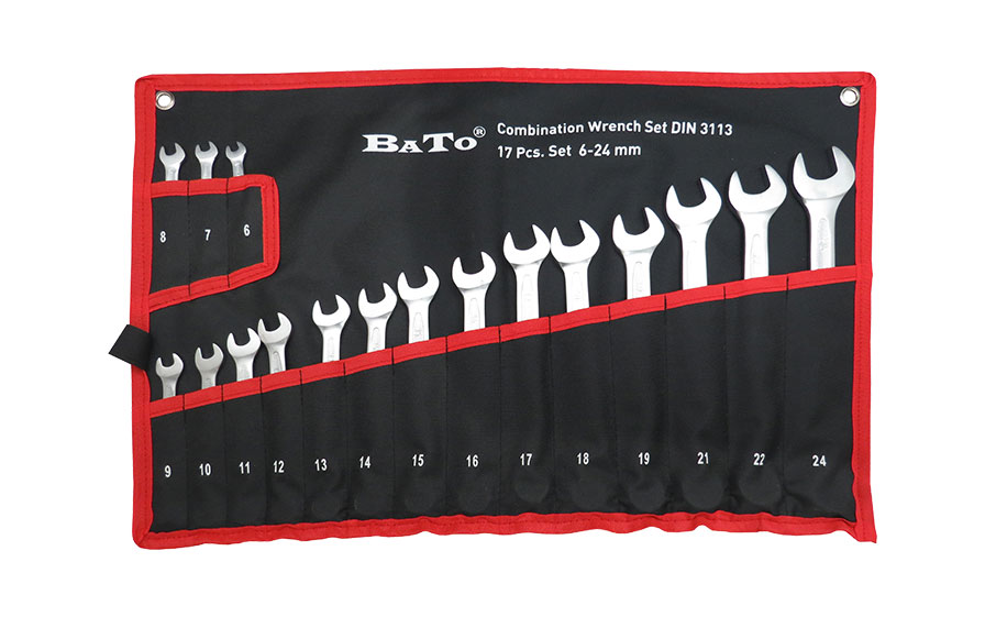 U-Ringnycklar i mm utförande enligt DIN 3113A standard med vinklat ringhuvud 15° vinkel. Tillverkad av kromvanadinstål, mattförkromad med halkfritt skaft. Satsen innehåller 17-delar: 6-7-8-9-10-11-12-13-14-15-16-17-18-19-21-22-24mm.