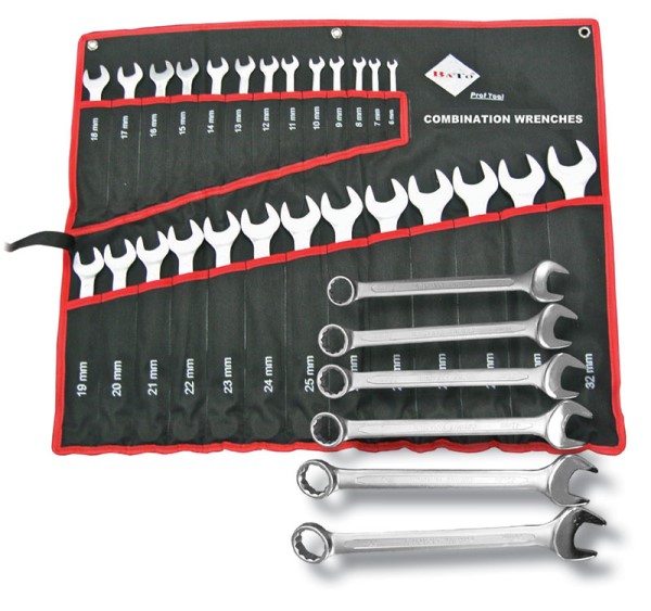 U-Ringnycklar i mm utförande enligt DIN 3113A - ISO 3318 standard med vinklat ringhuvud 15° vinkel. Tillverkad av kromvanadinstål, mattförkromad med halkfritt ovaltskaft. Satsen innehåller 32-delar: 6-7-8-9-10-11-12-13-14-15-16-17-18-19- 20-21-22-23-24-25-26-27-28-29-30-32-34- 36-38-41-46-50mm. -
