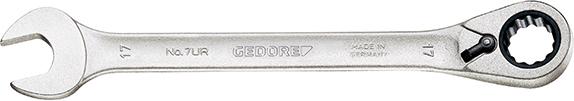 Vinklad U-ringspärrnyckel fabrikat Gedore med 10 mm nyckelvidd, längd 160 mm. Tillverkad av Gedore Vandiumstål 31 CrV3, kromad. Spärr med 52 tänder ger 7° mellan varje klick. Enligt DIN 3110, ISO 3318. Ringände vinklad 13 grader med omkopplare för höger/vänstergång. -