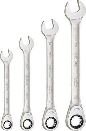Rak U-ringspärrnyckelsats fabrikat Gedore med 10-13-17-19 mm nyckelvidd. Tillverkad av Gedore Vandiumstål 31 CrV3, kromad. 10-13 mm har spärr med 52 tänder ger 7° mellan varje klick, 17-19 mm har spärr med 60 tänder ger 6° mellan varje klick. Enligt DIN 3110, ISO 3318. I fodral.