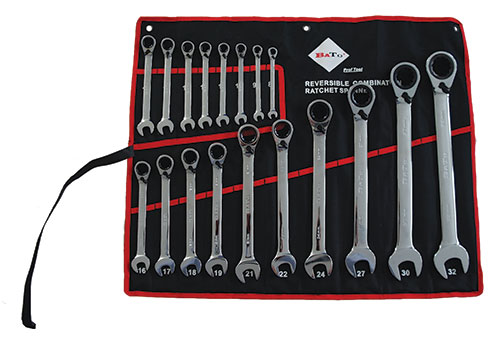 U-Ringspärrnycklar tillverkade av kromvanadinstål. Omställbar spärrfunktion för höger- eller vänstergång. Ringhuvudet är vinklat 15°. Samma nyckelvidd i båda ändar. Satsen innehåller 18-delar: 8-9-10-11-12-13-14-15-16-17-18-19-21-22-24-27-30-32mm spärrnyckel är med 72 tänder